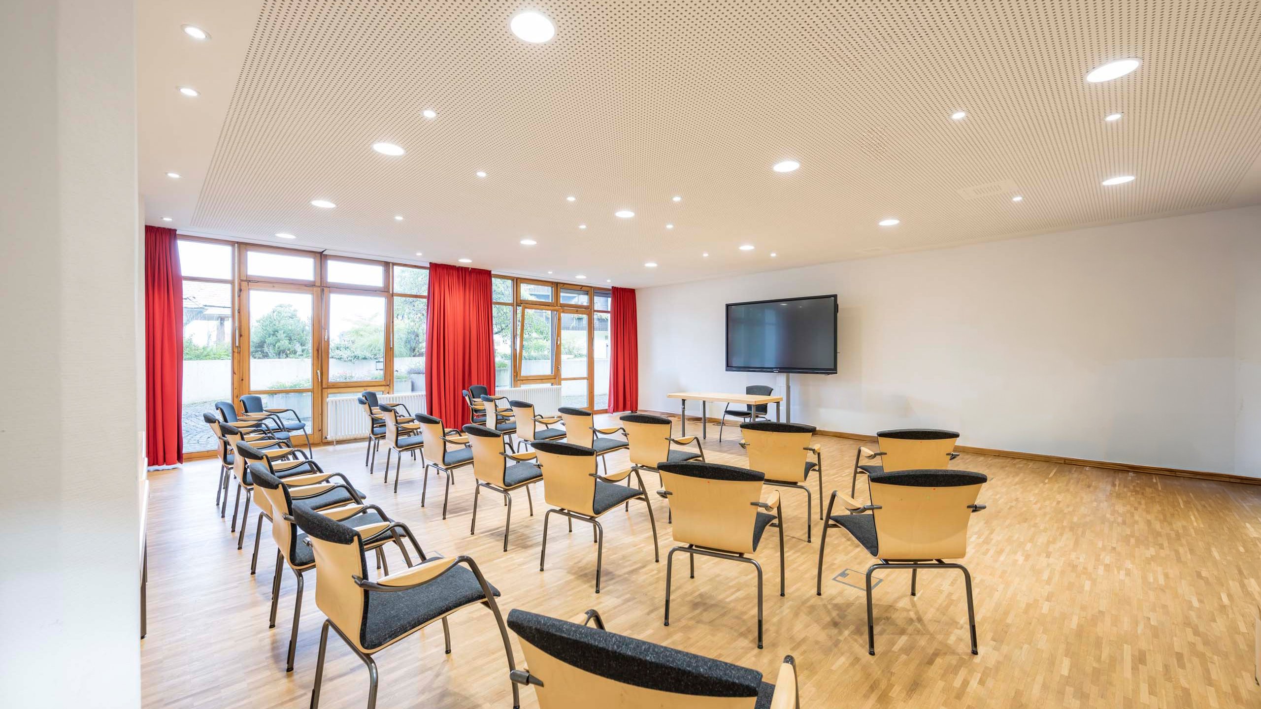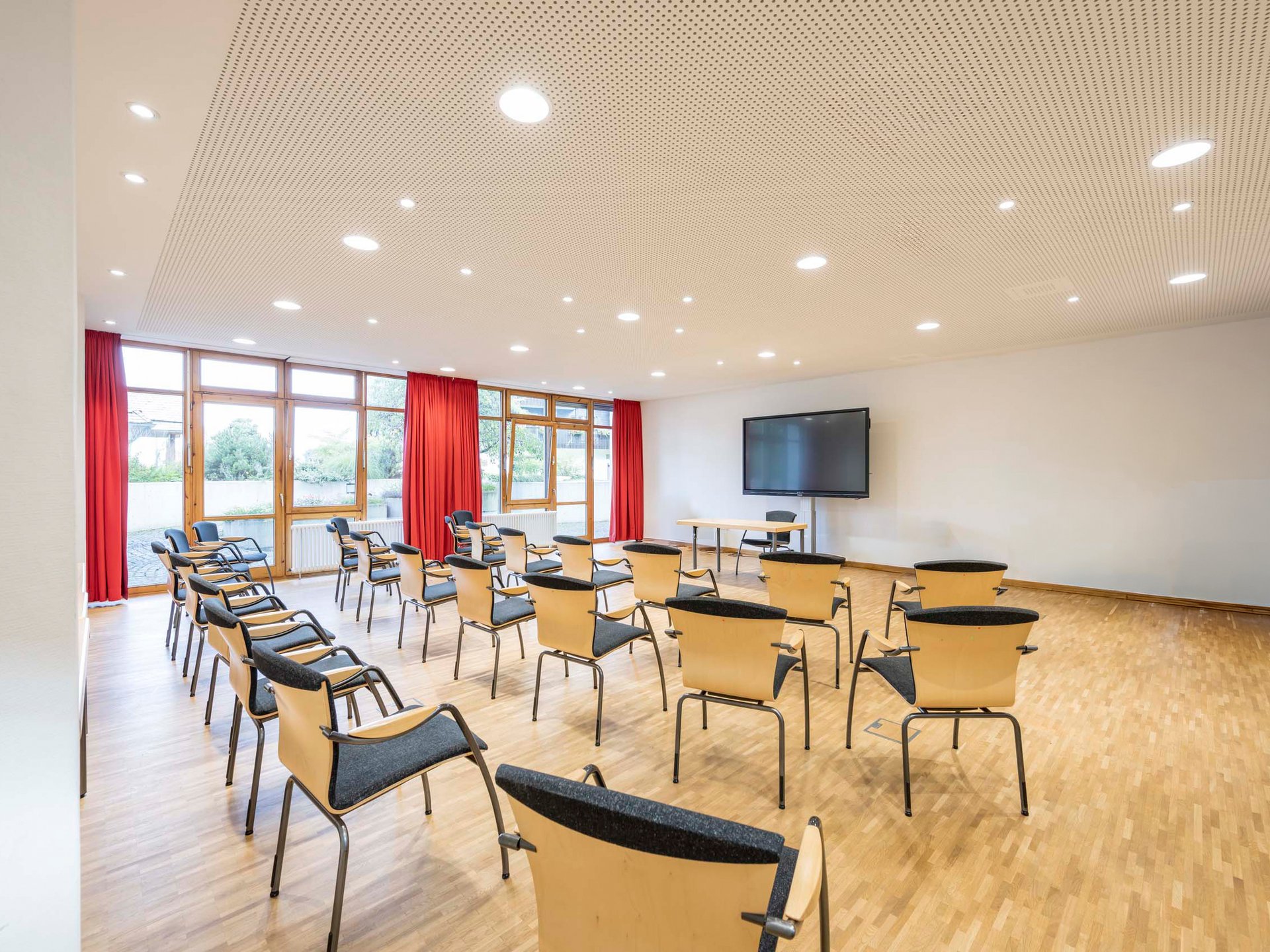 Alle unsere Tagungsräume verfügen über große Fenster für natürliches Tageslicht, eine individuell steuerbare Beleuchtung (inklusive Abdunkelungsmöglichkeit) sowie einen hochwertigen Parkettboden. Kostenloses WLAN steht Ihnen auf dem gesamten Hotelgelände zur Verfügung.