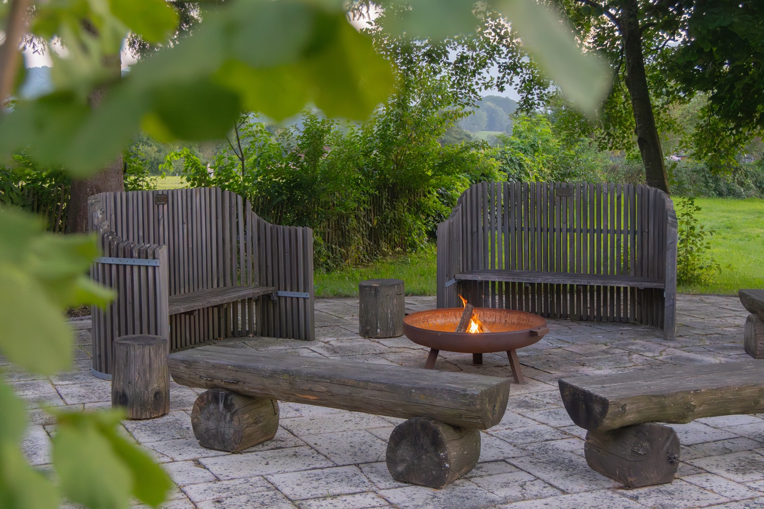 Was gibt es Schöneres als einen lauen Sommerabend am Lagerfeuer zu verbringen? Nehmen Sie sich ein Getränk mit nach draußen in den Hotelpark und machen Sie es sich um die wärmende Feuerschale herum bequem.