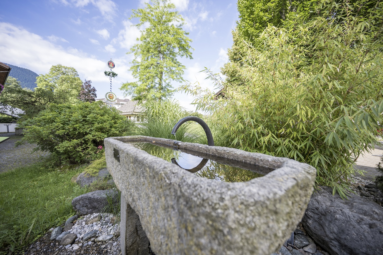Der Park rund um die Häuser des Hotel Alpenblick umfasst 2 Hektar und lädt zu Spaziergängen am Fuße der Alpen oder einer entspannten Pause unter freiem Himmel ein. Im Park finden sie zahlreiche Sonnenliegen und Sitzgelegenheiten, um den Ausblick auf das Bergpanorama auf sich wirken zu lassen.